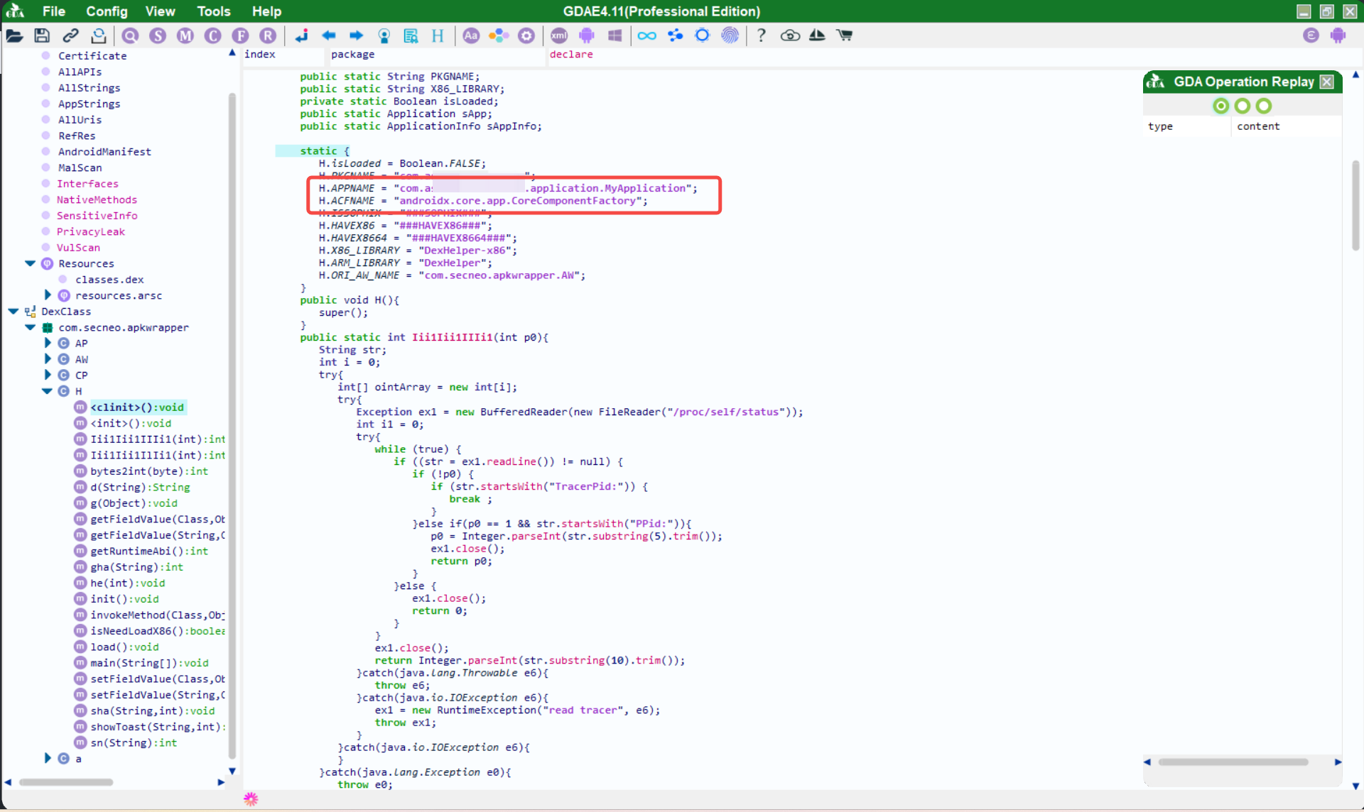 反编译classes.dex在com.secneo.apkwrapper.H类中找到原入口APPNAME、ACFNAME