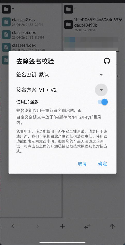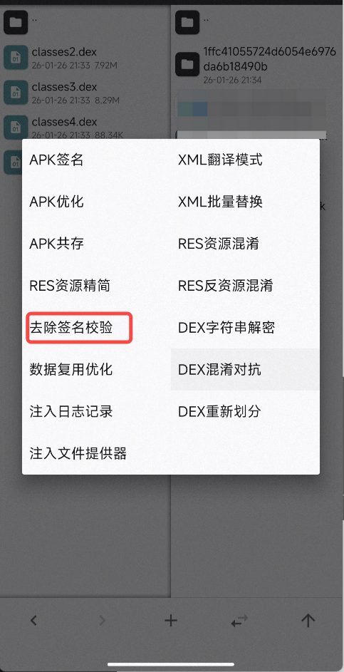 鉴于Frida对持久化支持不好,尝试使用jsHook工具也不稳定,后期测试每次都需要借助电脑注入脚本,主要是也绕不过去加固包的检测。于是尝试脱壳修复方法,前期同事否认了我的方案,认为脱壳出来的dex支离破碎,也不完整,只能阅读代码,不能够再恢复成未加固包。同事使用的脱壳手机脱出来的dex确实很凌乱,有重复和不完整,用这个dex进行修复确实无法运行,要么闪退无法运行,要么没有成功去除签名检测,加固的签名检测仍然生效,刚打开弹出一句提示就退出了。